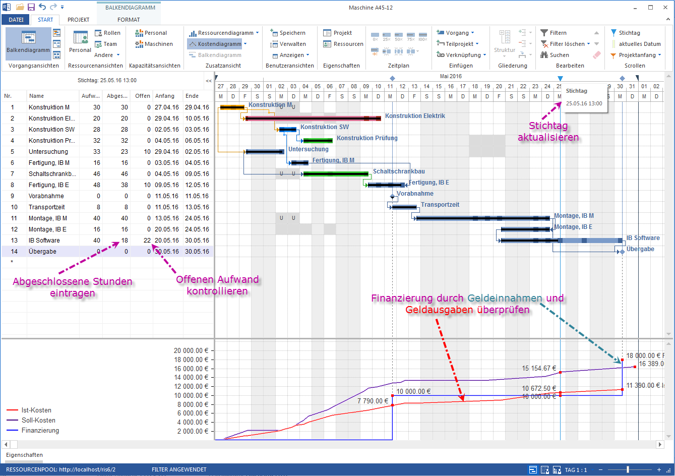 - Die zur Verfügung stehenden Ressourcen, sollen in der Software erfasst und den Aufgaben zugewiesen werden können.